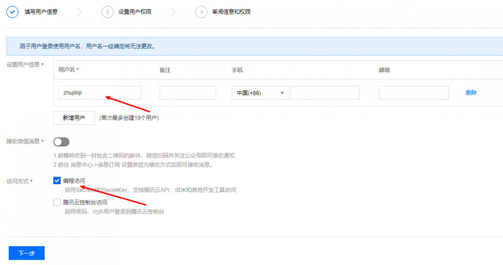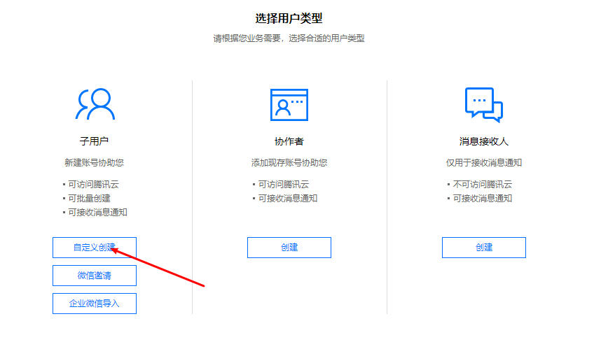 打开云产品 – 访问管理 – 用户 – 用户列表,新建一个子用户,类型选自定义创建