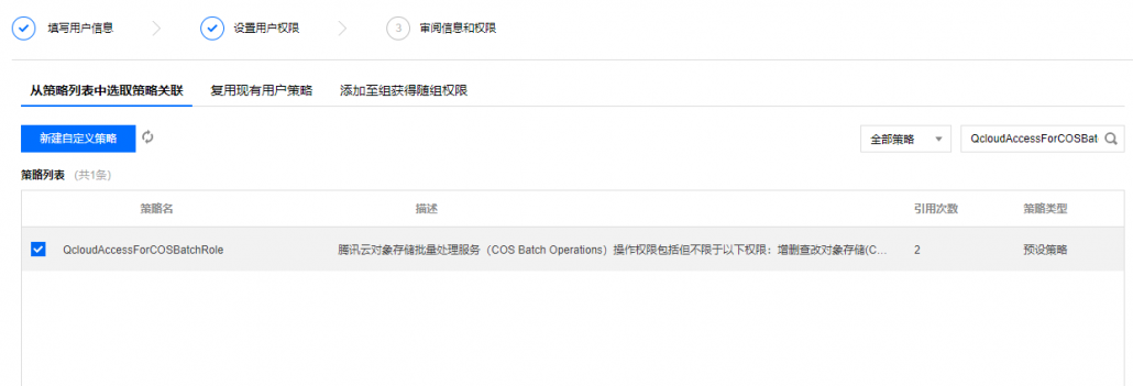 在策略中,我们只需要选择一个权限 QcloudAccessForCOSBatchRole,这样这个子用户就只能操作COS相关的资源,不会影响到账号内的其他服务