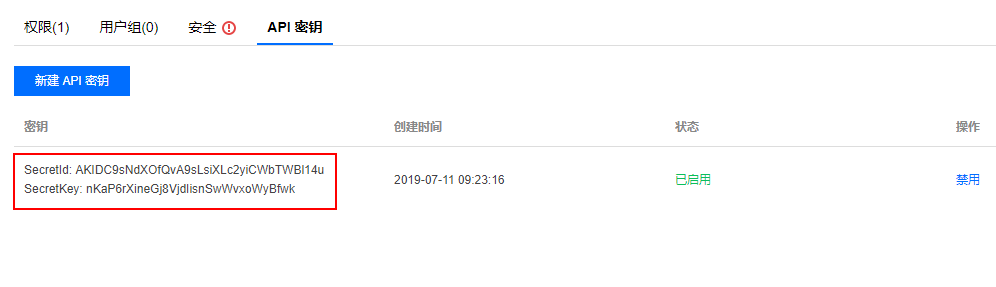 这样,一个子用户就创建完成了,获取到 SecretId 和 SecretKey