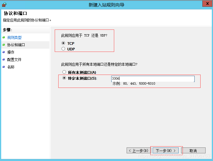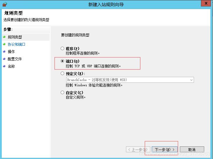 选择类型TCP或UDP,输入端口,点击下一步,下一步。